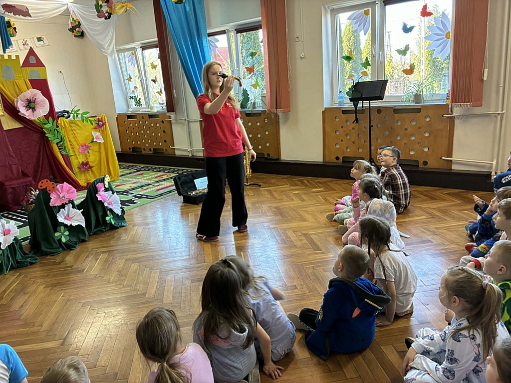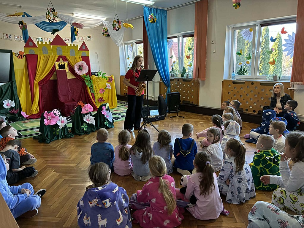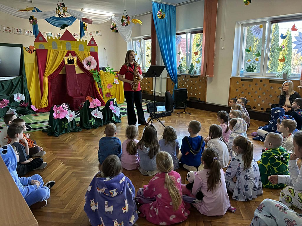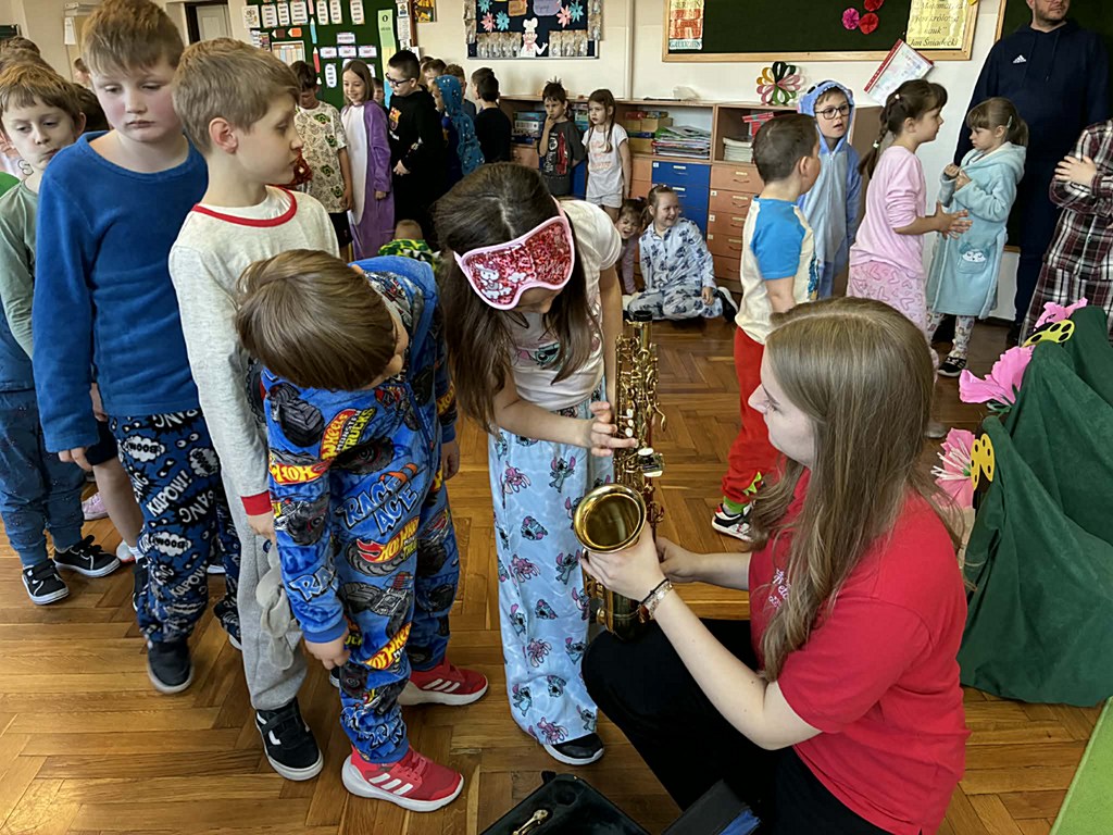 Dzieci miały okazję dowiedzieć się, jak jest on zbudowany oraz jak wydobywa się z niego dźwięk. Uczniowie wzięli także udział w krótkich ćwiczeniach, dzięki którym mogli poczuć, jak ważny jest oddech podczas gry na instrumentach dętych. Najwięcej radości sprawiło jednak wspólne słuchanie melodii – pani grała znane utwory z bajek, a uczniowie z entuzjazmem próbowali je odgadnąć.