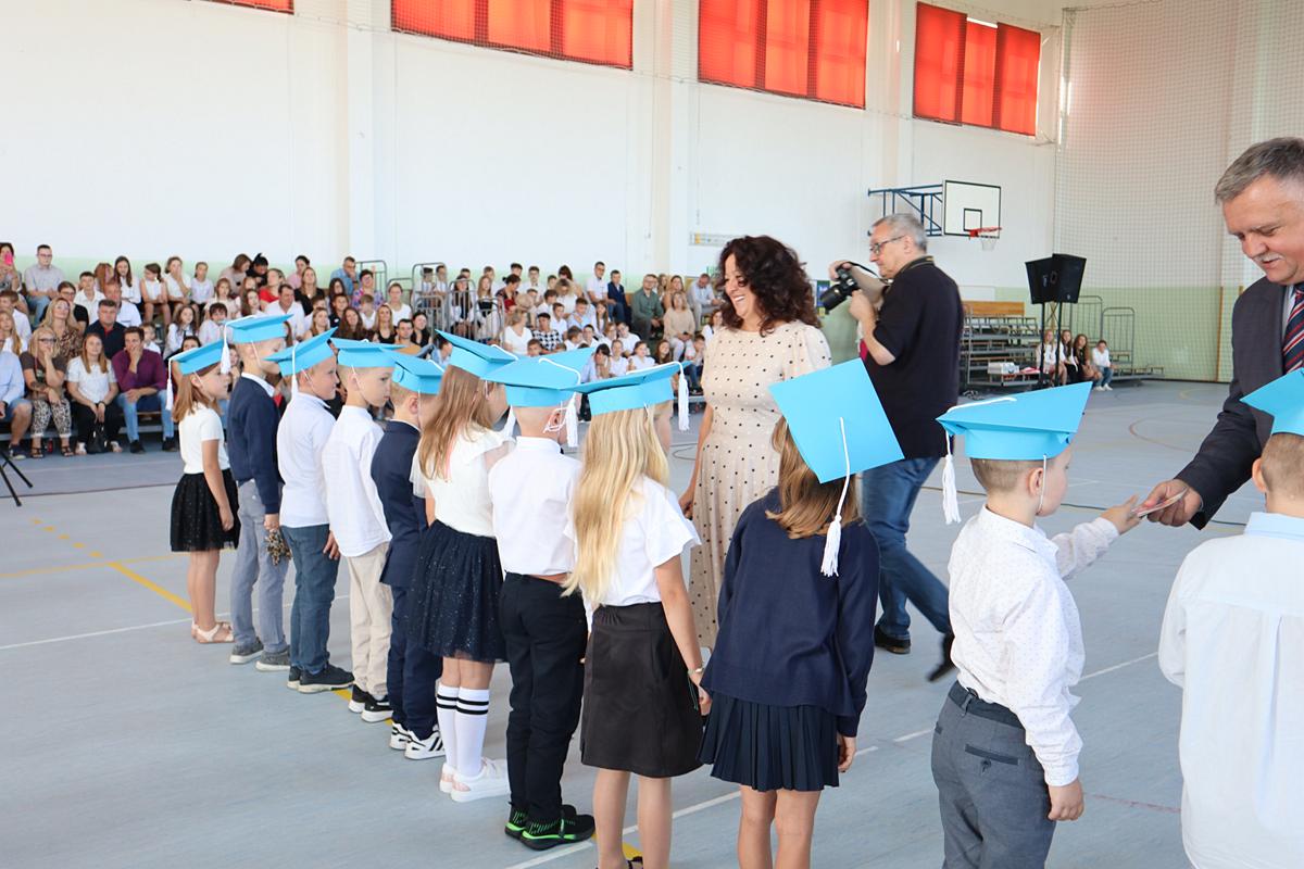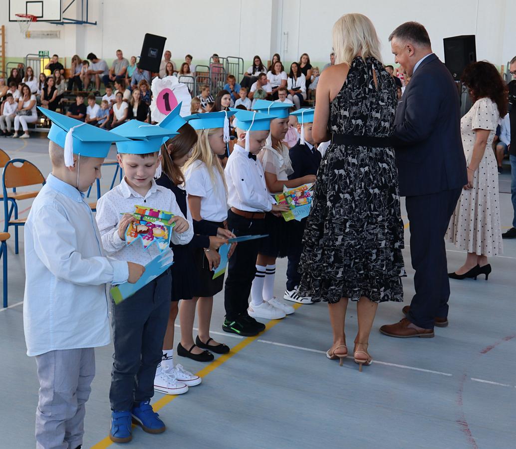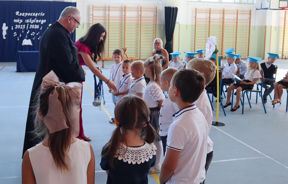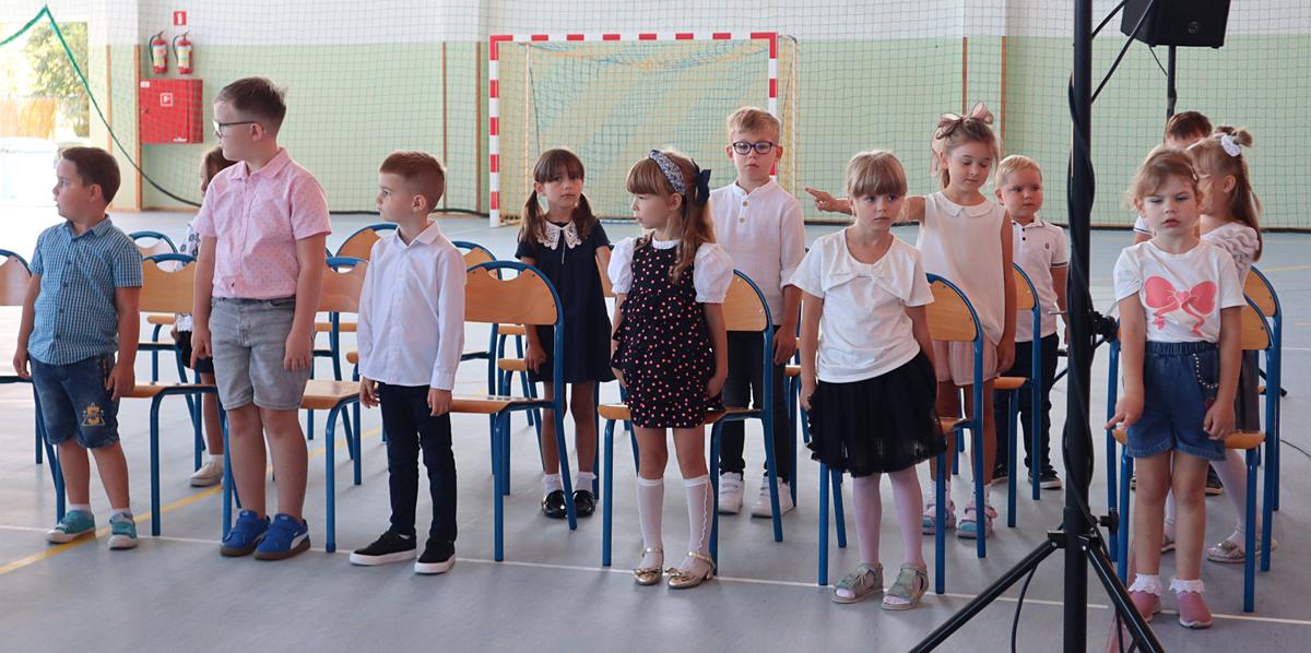 Głos zabrała przewodnicząca Rady Rodziców, a następnie pani dyrektor, kierując do społeczności szkolnej ciepłe słowa wsparcia i otuchy. Szczególnie uroczystym momentem było pasowanie i ślubowanie uczniów klas pierwszych. Pierwszoklasiści, składając przysięgę, stali się pełnoprawnymi członkami naszej szkolnej społeczności. Otrzymali także pamiątkowe dyplomy, które będą im przypominały o tym wyjątkowym dniu. Nie zabrakło również powitania najmłodszych – przedszkolaków, którzy otrzymali pamiątkowe medale, symbolizujące początek ich edukacyjnej przygody w naszej placówce. Po części oficjalnej uczniowie wraz z wychowawcami oraz rodzicami udali się do klas na pierwsze spotkania w nowym roku szkolnym. Był to dzień pełen radości i dobrej energii, która – mamy nadzieję – będzie towarzyszyć nam przez cały rok szkolny.